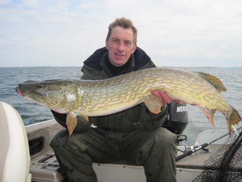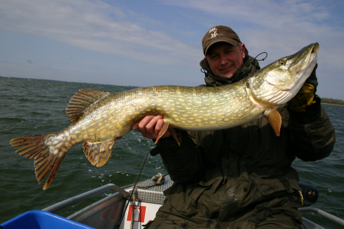 Wir hatten sie gefunden und sie wollten fressen. Nun galt es dem anderen Boot diese Informationen zukommen zu lassen. Und siehe da, kurz nach erreichen der viel versprechenden Stelle konnte auch der „Flügelmann“ (kleinen Gruß an Maverick) den ersten Esoxs verhaften. Insgesamt gelang es uns in kurzer Zeit fünfzehn Fische zu fangen. Die Top drei waren mit 105, 112 und sagenhaften 120 cm einfach tolle Fische die uns einen super Drill verschafften und natürlich schonend wieder in die Freiheit entlassen wurden. Doch so plötzlich wie die Beißphase begonnen hatte war sie auch wieder vorbei. Mit dem Ergebnis konnten wir jedoch den ersten Tag hoch zufrieden und glücklich beenden.