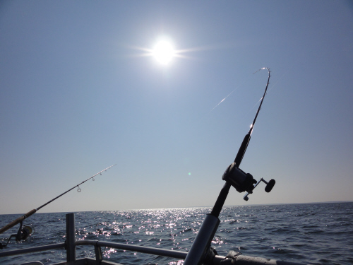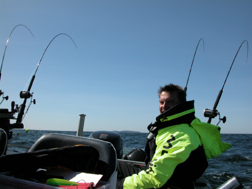 Am Abend, wie auch an den folgenden Abenden, wurde dann erst einmal in der alten Schule in Schaprode fürstlich gespeist und Pläne für den folgenden Tag geschmiedet. Aufgrund der Wettervorhersage entschloss sich eine Bootsbesatzung den Ritt auf die Ostsee zu wagen und den Lachsen nachzustellen. Leider ließ sich jedoch kein Lachs zum Anbiss verleiten, aber sie haben es versucht. Auf der Rücktour wurde dann noch ein kurzer Zwischenstopp vor Hiddensee eingelegt um noch ein paar von den leckeren Dorschen zu erbeuten, wovon nun einige ihr Dasein als Filets in der Kühltruhe fristen und auf ihre Verspeisung warten.