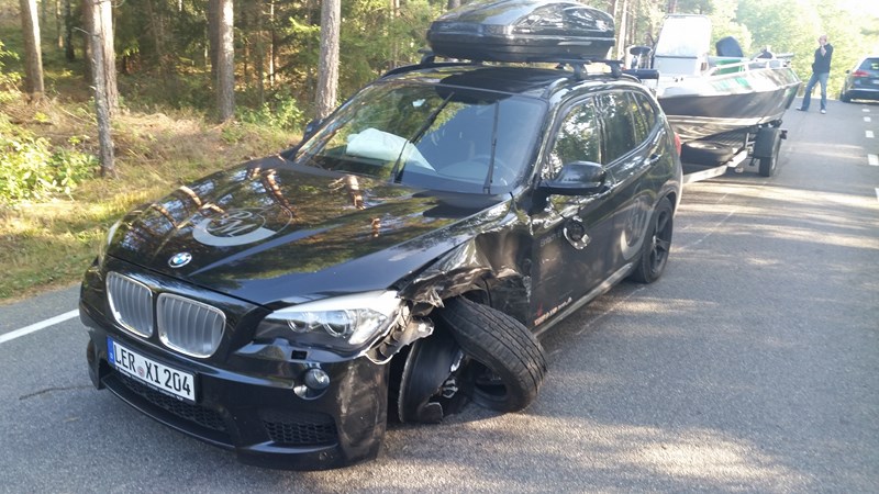 Gerrit, Frank und ich hatten vielleicht die ersten 15 Minuten der Rückreise geschafft, als es passierte: auf der steilen Kuppe der schmalen Waldstraße in den Schären fuhren wir etwas zu weit auf der linken Seite, so dass wir ein entgegenkommendes Fahrzeug zu spät sahen um ausweichen zu können. Ein kurzer Aufschrei des Fahrers, dann der fast zeitgleiche Knall des Aufpralls und der Airbags. Nach dem ersten Schrecken und dem panischen Verlassen des Autos konnten wir zum Glück recht schnell auch den Fahrer des anderen Fahrzeugs aussteigen sehen. Wir hatten Glück gehabt! Beide Autos waren zwar hin, das Boot war ein Stück auf dem Trailer nach vorn gerutscht, aber ansonsten schien es nur die beiden Autos erwischt zu haben.