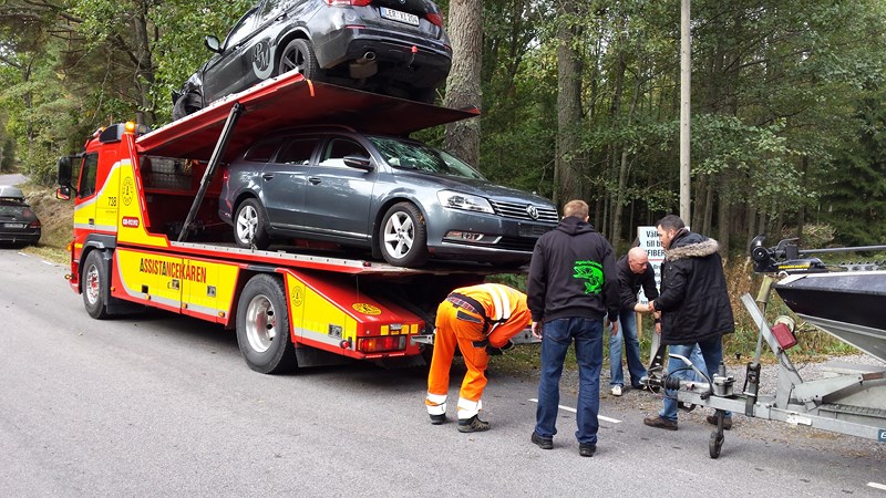 Es dauerte sicherlich 2 Stunden, bis ein Abschleppwagen auftauchte. Genau, es war EIN Abschleppwagen. Wie schön, dass der schwedische Fahrer durch Flexibilität glänzte, in dem er auf die obere Ebene des kleine LKW Fahrzeug Nummer eins zog, auf die untere Ebene dann Fahrzeug Nummer zwei und per Anhängerkupplung dann unser Boot. Angekommen in der nächstgelegenen Stadt wurden die Fahrzeuge auf die Fachwerkstätten verteilt. Wir hatten bis dahin noch die Illusion, dass man uns aufgrund von Gerrits ADAC-Plus-Mitgliedschaft sicherlich schnell ein entsprechendes Leihfahrzeug zur Verfügung stellen würde, damit wir unsere Reise fortsetzen könnten. Immerhin hatten wir gerade einmal einige km geschafft und noch eine Fahrt von ca. 14 Stunden vor uns. Das Unfallfahrzeug, so dachten wir, würde man bestimmt nach der Reparatur, sofern das denn noch möglich sei, zurück nach Deutschland bringen. So standen wir nun mit einem Boot auf einem Trailer in einem Gewerbegebiet bei der Abschleppfirma und die Telefone liefen heiß.